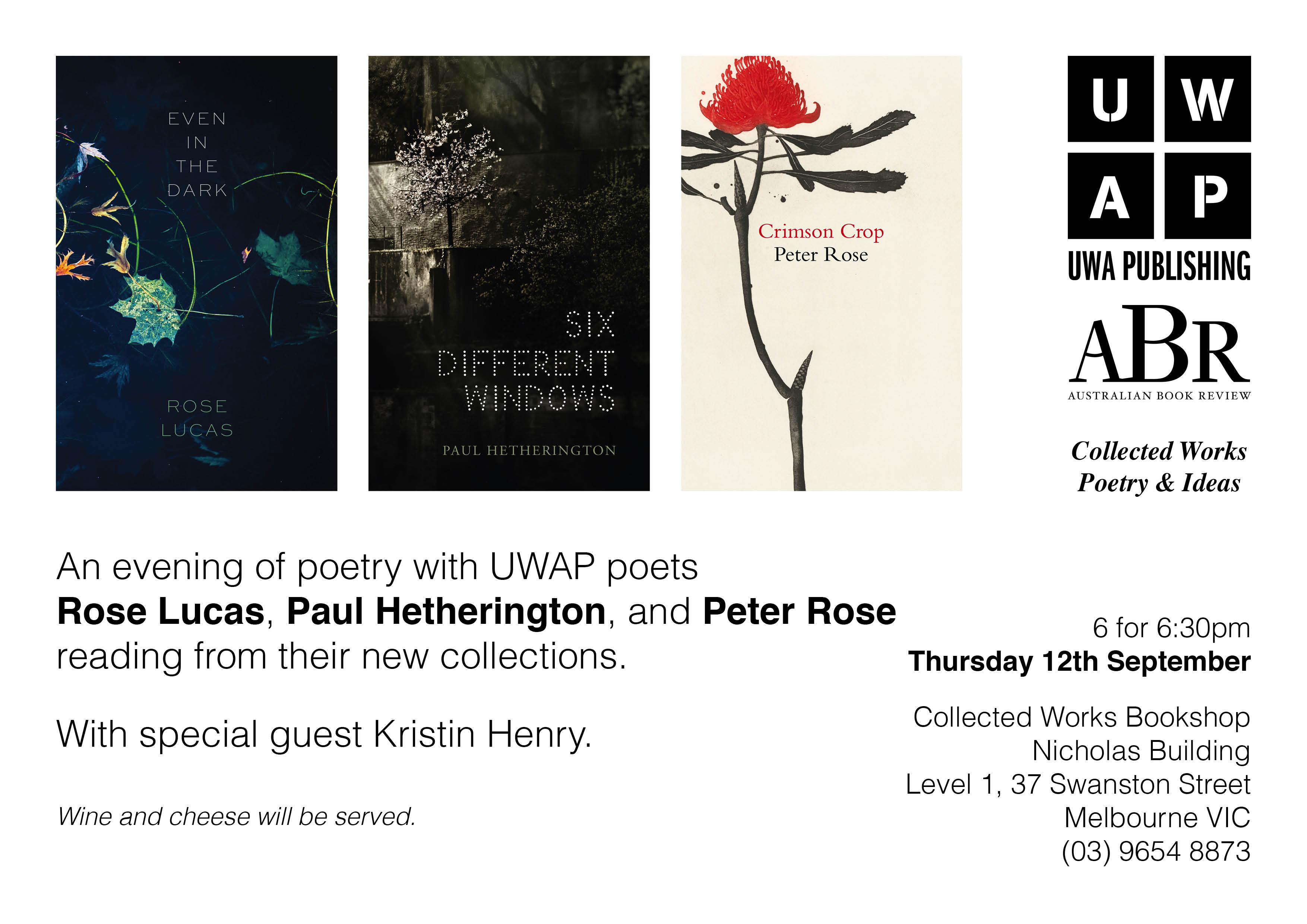 Poetry Reading at Collected Works Thursday 12/9, 6pm Leave a reply Tomorrow evening I have the fabulous opportunity to read alongside other poets Peter Rose and Paul Hetherington. Do come along to the famous Collected Works at 6pm to hear us all. Share this:Share Click to share on X (Opens in new window) X Click to share on Facebook (Opens in new window) Facebook Click to share on LinkedIn (Opens in new window) LinkedIn Click to share on Pinterest (Opens in new window) Pinterest Like Loading...