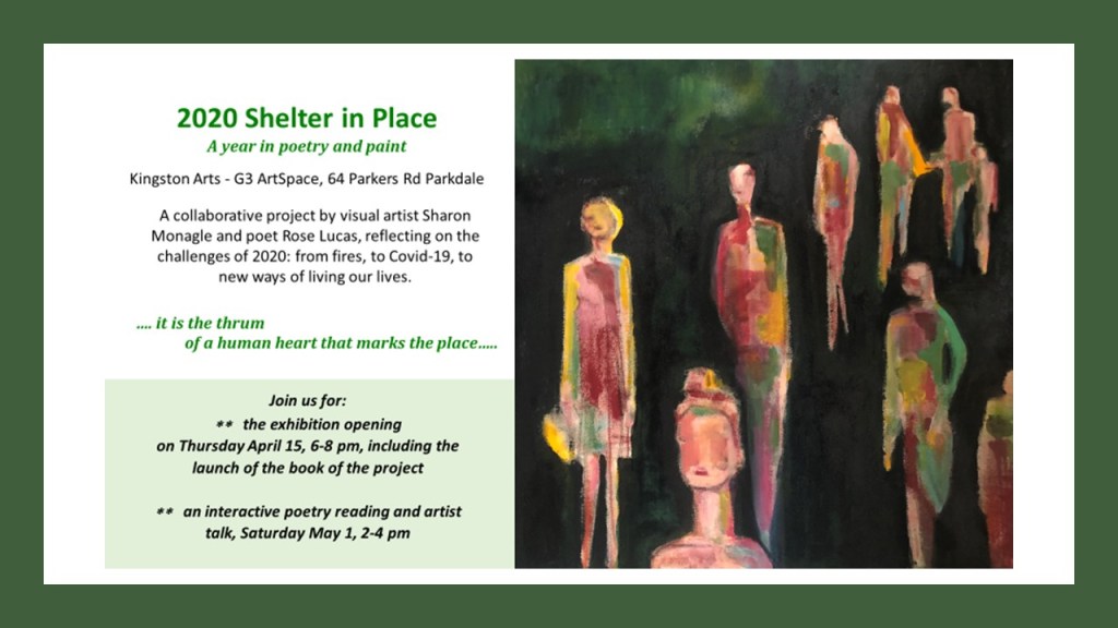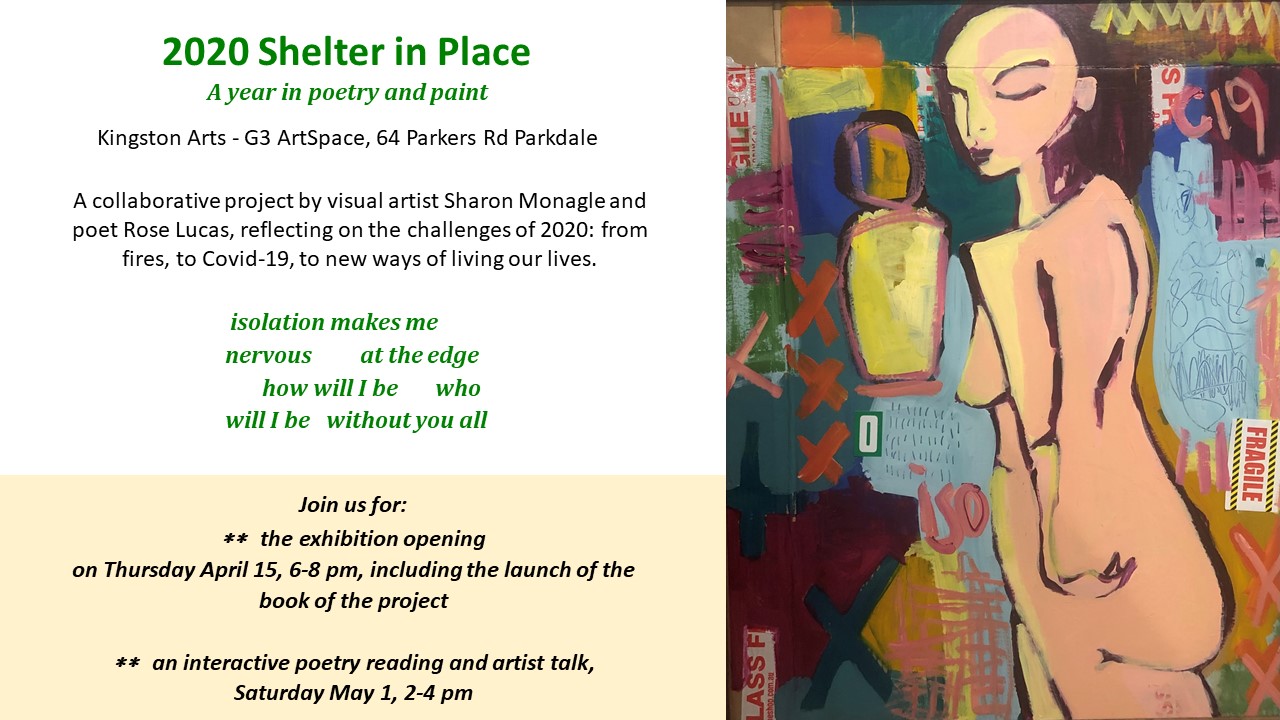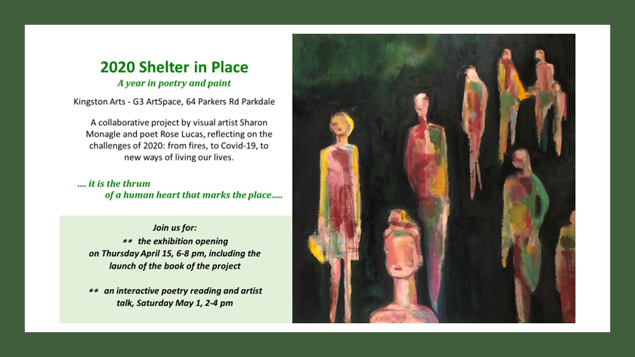 My new collaborative exhibition, 2020 Shelter in Place with visual artist Sharon Monagle, opens at the Kingston G3 Gallery Space in Parkdale. Emerging from the realities of ‘friendship in isolation,’ these conversations in poetry and paint track us through that strange year.